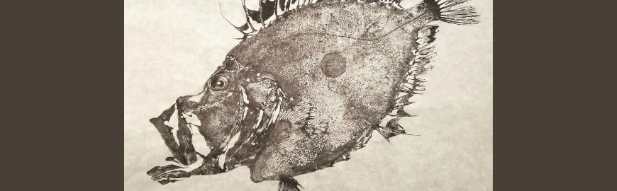 Japanese gyotaku (lit. ‘fish rubbing’) is the unlikely marriage of fish, sumi ink, and washi paper. Once used to record the size of an impressive catch, it has been elevated to a fine art through the efforts of gyotaku masters. "Impressions of the Seas: Gyotaku Fish Prints" by Dwight Hwang features a selection of prints depicting freshwater, coastal and open ocean specimens alongside objects which detail the gyotaku printmaking process.