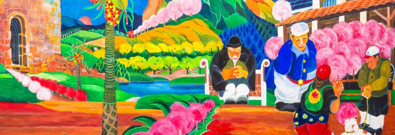 Nobuo Anzai’s paintings are heartfelt memories of countries he calls homes—Brazil, Colombia, Spain, and Japan. They are unseparated in his mind and heart through his life’s passages as a migrant worker, farmer, chef, and artist. The Fukushima born Nobuo spent his childhood during the upheaval years of the Pacific War. At age 23, he emigrated to Brazil to serve two years in agricultural farming as part of a contract with the Japanese and Brazilian governments. Upon completing this obligation, he trained to become a sushi chef and opened his first shop in São Paulo. A natural and adventurous journeyman at heart, Nobuo would spend the next four decades migrating to Colombia, Spain, and Los Angeles, California. His chosen path is in part life’s necessity for survival and, at spiritual depths, a yearning for connecting to these native countries.